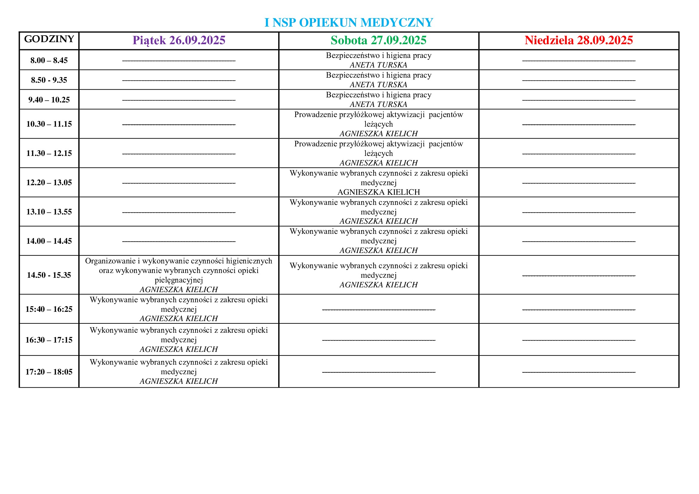Zjazd 19-20-21.09.2025 r. Niepubliczna Szkoła Policealna w Kozienicach ZDZ w Kielcach OPIEKUN MEDYCZNY